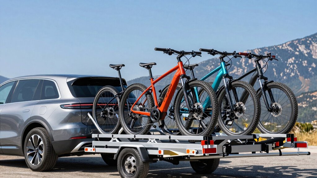 Loading heavy e-bikes onto a trailer hitch rack can be challenging, but the right features make the process much easier. A built-in ramp or loading assist can markedly reduce the effort needed, especially for heavier bikes. Telescoping or extendable ramps offer easier access for bikes with high ground clearance or low frames. Wide, non-slip ramps improve safety and stability during loading and unloading. Adjustable or slide-out support arms help position bikes properly and secure them easily, streamlining the process. Additionally, lightweight, foldable, or removable ramps make loading quicker and less cumbersome, especially if you need to store them away. Overall, these features simplify loading, saving you time and effort while ensuring your e-bikes are handled safely and securely.