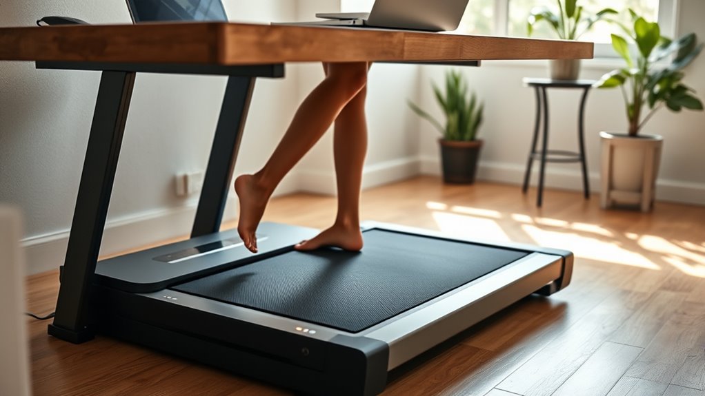 When selecting an under desk treadmill walking pad, safety and cushioning should be top priorities because they directly impact comfort and injury prevention. Good cushioning absorbs impact, reducing stress on your joints during walks. Features like multi-layer belts and suspended decks are essential, as they notably lower joint and muscle strain. Cushioning systems that evenly distribute impact prevent localized pressure points, making walking more comfortable and safer. Proper shock absorption not only enhances comfort but also minimizes noise, which is especially important in shared or office environments. These features help prevent injuries caused by repetitive impact, particularly for those with pre-existing joint issues. Prioritizing safety and cushioning ensures your walking experience remains enjoyable, safe, and gentle on your body, encouraging consistent use.