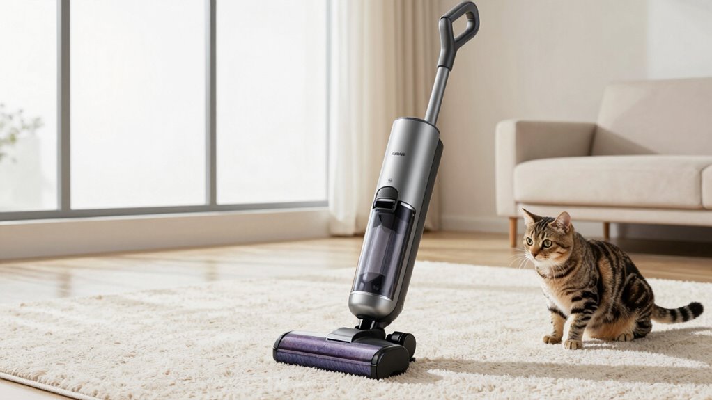 Effective pet hair removal tech can make or break your cleaning routine. I look for vacuums with self-cleaning brushrolls that prevent hair wrap, ensuring consistent suction and less maintenance. Advanced brushrolls with hair Pro grip technology are fantastic—they actively lift and capture stubborn pet hair from carpets and floors. Sensors like Dirt Detect help the vacuum automatically adjust suction power based on surface type, optimizing pet hair pick-up. HEPA filters combined with anti-allergen seal technology are essential for trapping 99.99% of pet dander and allergens, which improves indoor air quality. Additionally, specialized tools like turbo brushes and crevice tools make tackling pet hair on upholstery, stairs, and tight spots much easier. These features ensure thorough cleaning while reducing ongoing hassle.