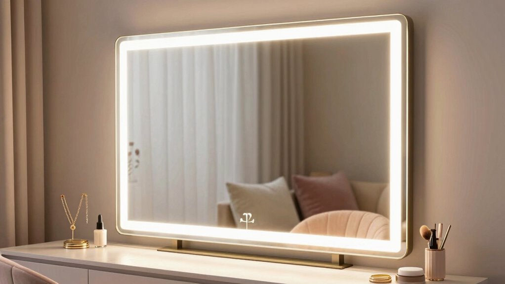 Selecting a vanity mirror with adjustable color temperature settings is essential for creating the perfect lighting environment for makeup application. Multiple options like warm, natural, and cool light allow me to customize the lighting to match different settings and needs. These adjustable modes help reduce eye strain and make it easier to match colors accurately for various skin tones and makeup shades. Switching between color temperatures also adds versatility, so I can use the mirror for daytime, evening, or professional looks. Some high-quality mirrors even include memory functions that remember my preferred settings, saving me time. Properly adjustable color temperature settings guarantee I get clear, true-to-life visibility, which makes my makeup look flawless under different lighting conditions.