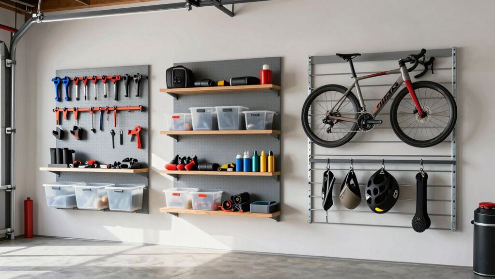 Maximizing space is essential for an efficient garage, and a well-designed wall-mounted storage system can make a significant difference. I look for systems that optimize vertical space, allowing me to store bulky tools and equipment without clutter. Adjustable and customizable shelving lets me tailor the setup to fit different sizes and shapes of items, making the most of every inch. Incorporating hooks, bins, and racks alongside shelves helps me utilize every available surface, adding multiple storage options in a compact area. Proper spacing between components prevents overcrowding and ensures I can easily access what I need. Modular systems are especially valuable—they let me expand or reconfigure the setup as my storage needs change, keeping my garage organized and functional over time.
