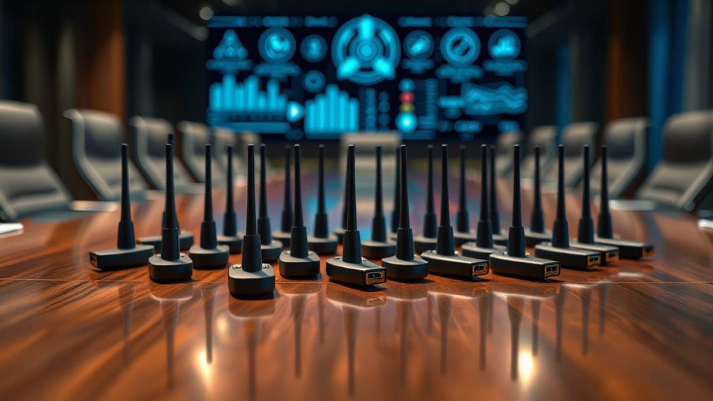 When choosing a wireless microphone for conference calls, it’s essential to take into account the size of the room to make certain everyone’s voice is heard clearly. The microphone’s pickup range should cover the entire space to prevent dead zones. For small rooms, a compact model with a focused pickup may suffice, but larger rooms require microphones with broader coverage, such as omnidirectional or array-based systems. Consider microphones with multiple capsules or expandability features like daisy chaining for bigger spaces. It’s also important to verify that the device’s maximum wireless range exceeds the room’s dimensions to avoid connection drops during meetings. Matching the microphone’s capabilities to your room size ensures consistent, high-quality audio and a seamless conference experience.