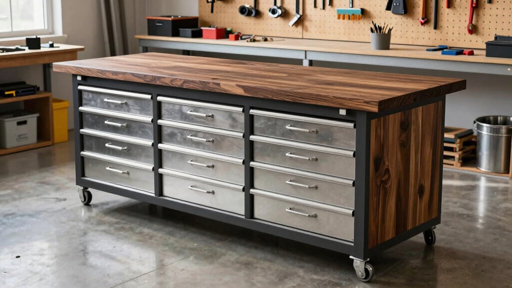 I find that steel and heavy-duty hardwoods are the most durable materials for workbenches. Steel offers incredible strength and longevity, perfect for heavy-duty tasks, while hardwoods like maple or oak provide resilience and resistance to wear. Combining a steel frame with a hardwood top gives me a sturdy, long-lasting surface that can handle tough projects without warping or damage. These materials make certain my workbench stays reliable over time.